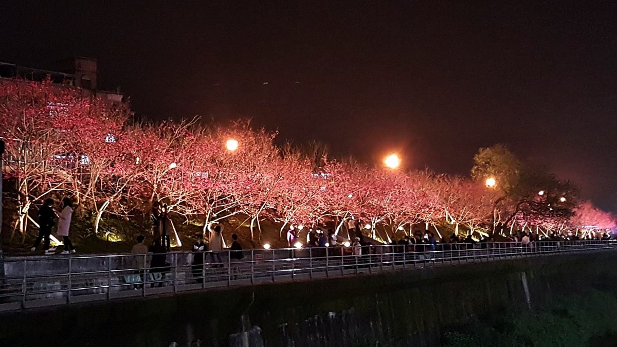 观赏在灯光衬托下的樱花